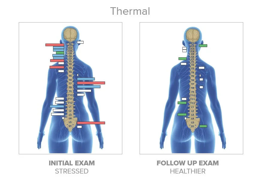 This scan measures temperature differences along the spine using gentle infrared sensors. Your autonomic nervous system controls automatic functions like digestion, heart rate, immune response, and healing. When there is imbalance, it can show up as uneven temperature patterns along the spine. It provides insight into how your body is functioning internally.