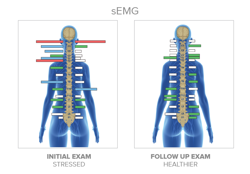 This scan measures electrical activity in the muscles along your spine. Muscles are controlled by nerves, so when we see increased tension or imbalance, it can indicate that certain areas of your nervous system are under stress or working harder than they should. The NeuroSpinal EMG Scanner helps us understand how your body is physically responding to stress.